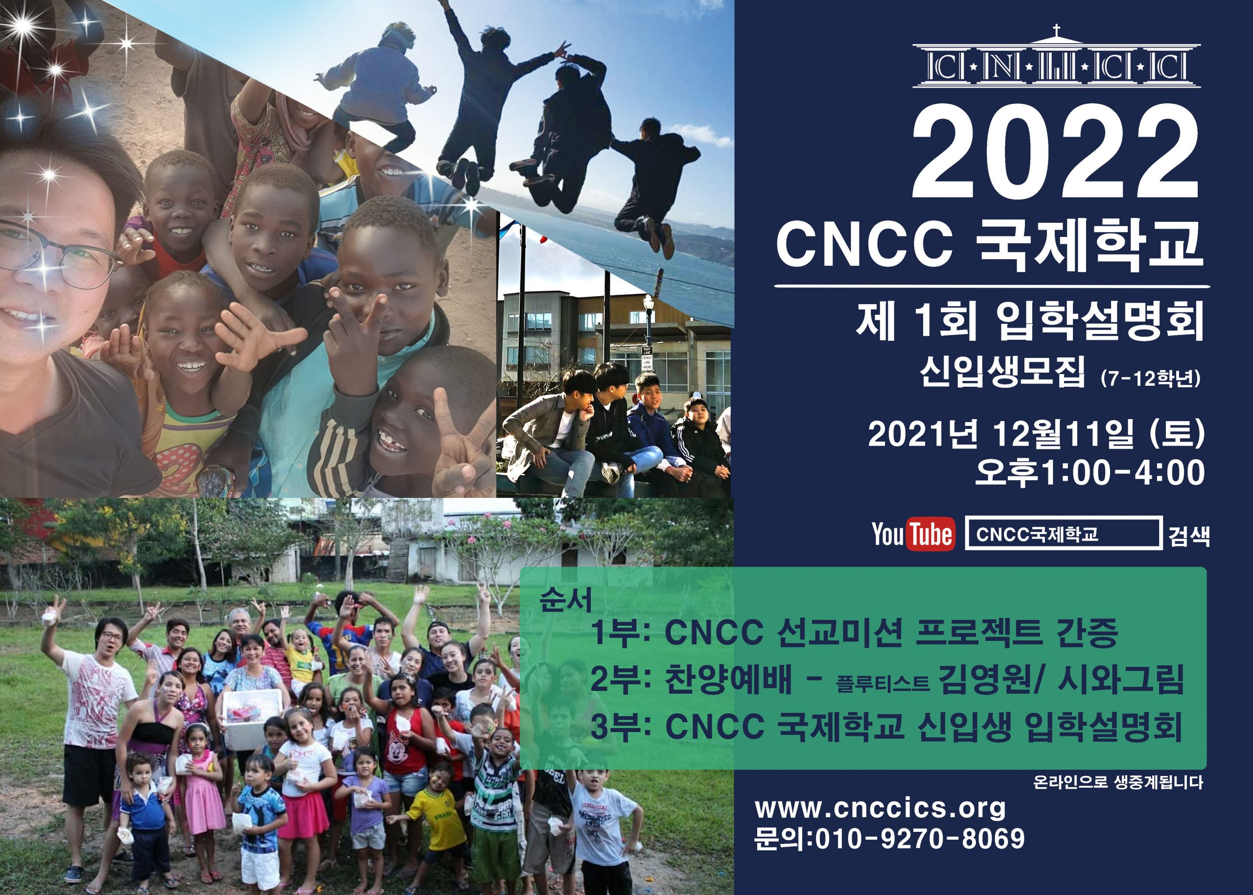 2021년 12월 11일 오후1시-4시 CNCC국제학교 제1회 입학설명회를 온라인으로 진행합니다. 유튜브 검색창에 ‘CNCC국제학교’를 검색하셔서 실시간 온라인 방송을 클릭하여 참여하실 수 있습니다.